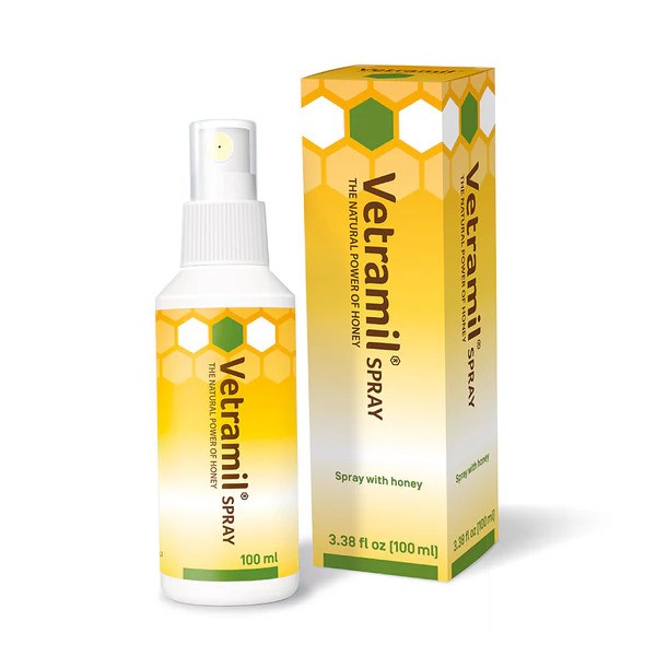 Vetramil® Spray is specially designed for animals with rough and irritated skin. This spray contains the same active ingredients as Vetramil® Ointment (honey, essential oils). The active honey components are delivered in a liquid formulation with excellent spraying properties.